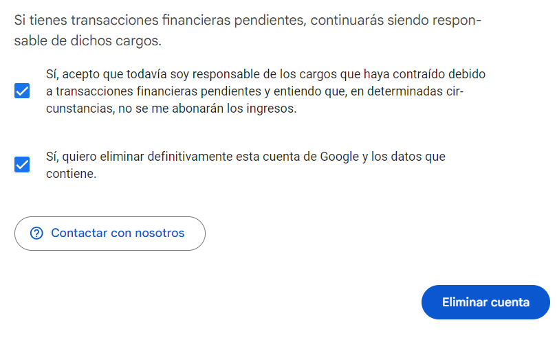 Por último, debes confirmar que te haces responsable de todos los gastos de funcionamiento de las transacciones financieras pendientes (podrías dejar de recibir algunos ingresos). También deberás confirmar que tu cuenta de Google y cualquier información asociada pueden eliminarse. Para ello, simplemente marca las casillas correspondientes: