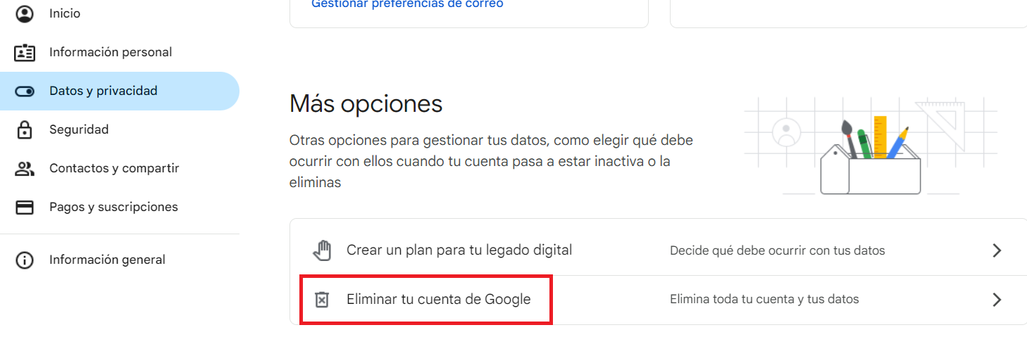 Paso 3: abre el menú “Eliminar tu cuenta de Google”