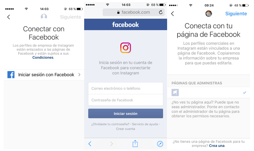 En este paso será necesario conectar tu perfil con tu cuenta de Facebook. Como mencionamos anteriormente, el perfil de empresa en Facebook es un requisito para utilizar Instagram Business. Si aún no tienes uno y quieres más información, visita nuestra guía para crear una página corporativa en Facebook.