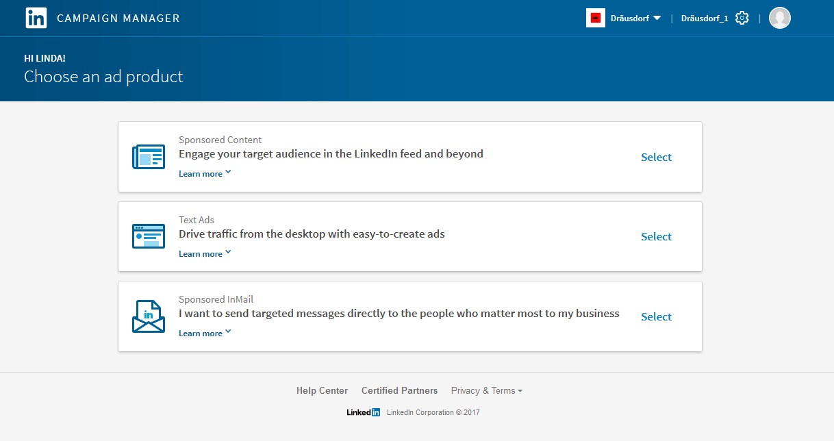 En el primer puesto de las herramientas de marketing que facilita la plataforma se sitúan las actualizaciones de contenido, que pueden usarse para aportar dos clases de información: esta opción permite, por un lado, informar sobre novedades en la empresa (de ahí el nombre de «actualizaciones»), como pueden ser el éxito de alguna campaña en particular, la promoción de productos o servicios nuevos o el anuncio de futuros socios colaboradores, pero también difundir otro tipo de contenido, teniendo en cuenta que se refiera al gran tema de los negocios. Aquí puedes informar a tus seguidores sobre cambios o evoluciones en el sector o comunicar ideas relacionadas con el aumento de la productividad. Con una estrategia de content curation ajustada a la audiencia puedes gestionar todo este contenido para obtener los mejores resultados. Involucrando a los empleados con su propio perfil y preguntándoles si no tendrían interés en compartir el contenido o en crearlo, puede incluso potenciarse el efecto de esta estrategia de curación de contenido. No hay que olvidar, no obstante, que los perfiles privados son responsabilidad de los usuarios y por lo tanto la página de empresa no debería inmiscuirse demasiado. Como extensión del perfil corporativo cabe la posibilidad de crear páginas asociadas y de productos. Se trata de páginas que comparten estructura y configuración con la página de empresa y que tienen el objetivo de destacar ciertas ofertas de forma especial. Con ellas es posible dedicar una página independiente a la marca, a un producto o a un servicio diferenciado. Con LinkedIn Ads se puede captar a un grupo de usuarios más amplio. Para ello la plataforma ofrece tres opciones, todas ellas accesibles desde el denominado Administrador de campaña: