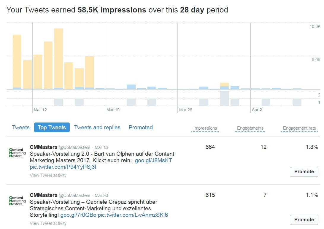 Los tuits más destacados demuestran rápidamente cuáles son los factores a los que los seguidores prestan más atención o los que tienen una repercusión positiva (fotos, encuestas, utilización de determinados hashtags), los cuales fortalecen los tuits y hacen aumentar los KPI. La lista que facilita la herramienta Twitter Analytics sobre los “mejores seguidores” y que tiene un gran alcance es, por el contrario, una interesante fuente de contactos para posibles colaboraciones de marketing.