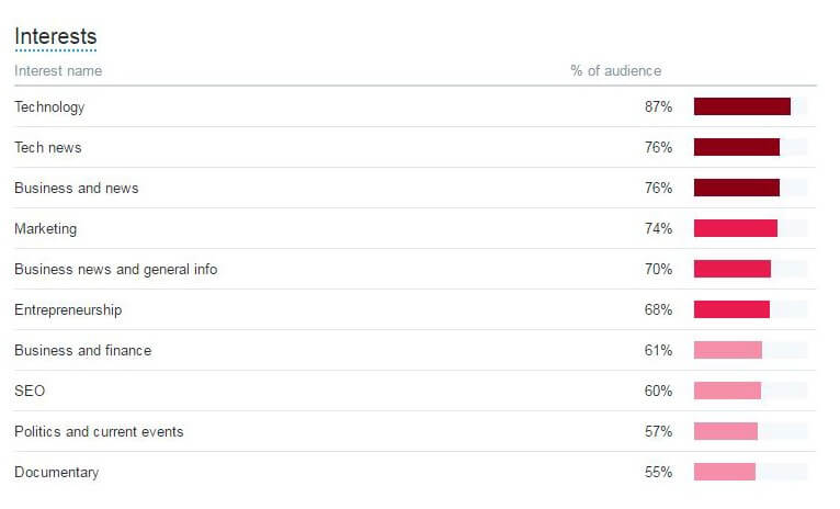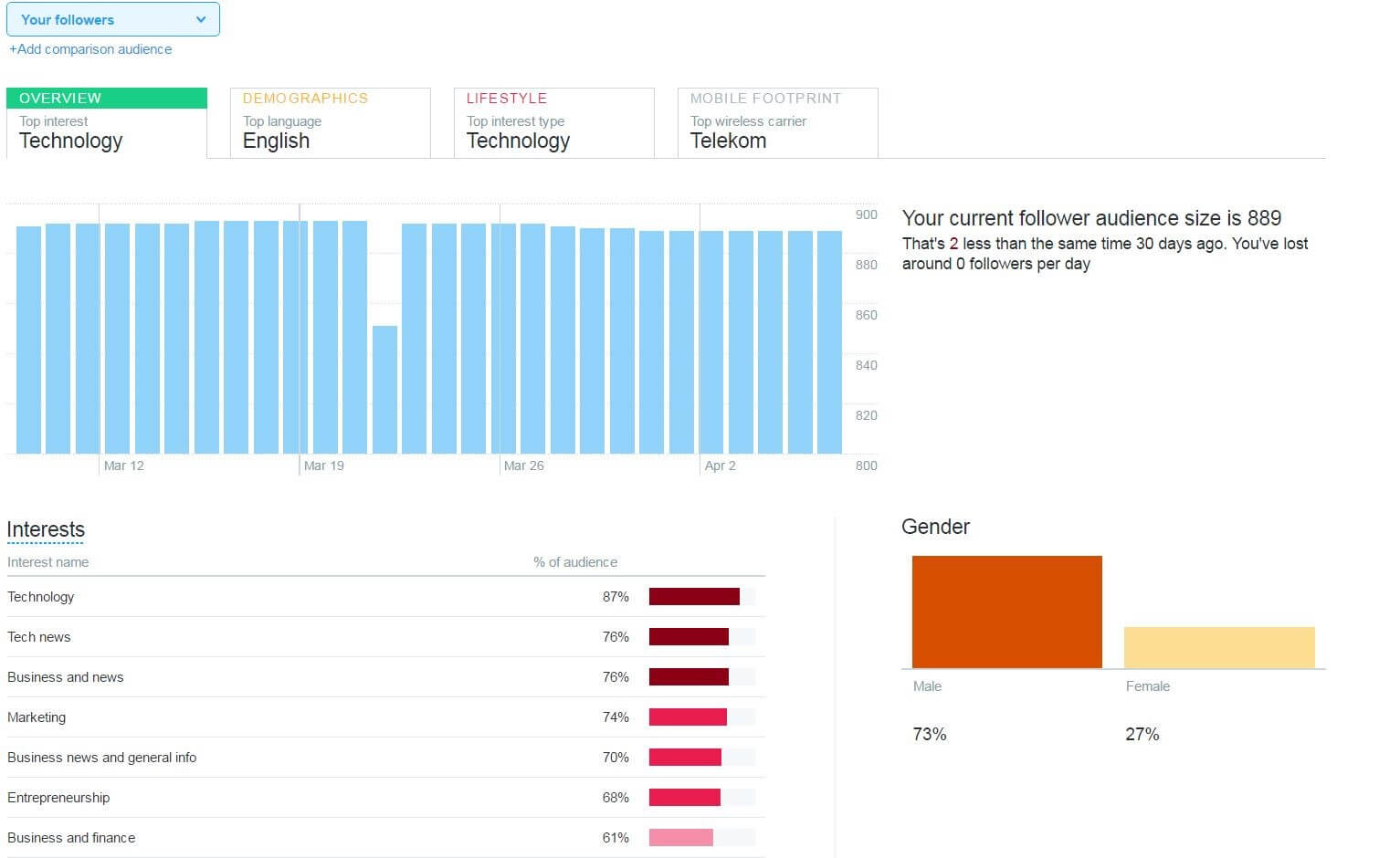 La información sobre el público objetivo es limitada y es que, por motivos de protección de datos, Twitter no facilita tantos datos sobre los seguidores como les gustaría a los social marketers. Por ello, existe una función a través de la que se puede conocer mejor a los seguidores por vía indirecta. Además de los datos sobre los propios seguidores, Twitter Analytics ofrece información sobre la totalidad de los usuarios de Twitter. Esta se divide en función de las mismas características de la información sobre los seguidores y permite establecer una comparación entre ambos grupos. Al comparar los propios usuarios con la totalidad de los usuarios de Twitter se puede entender mejor en qué se diferencian los propios seguidores del público en general y cuáles son los factores que les motivan.