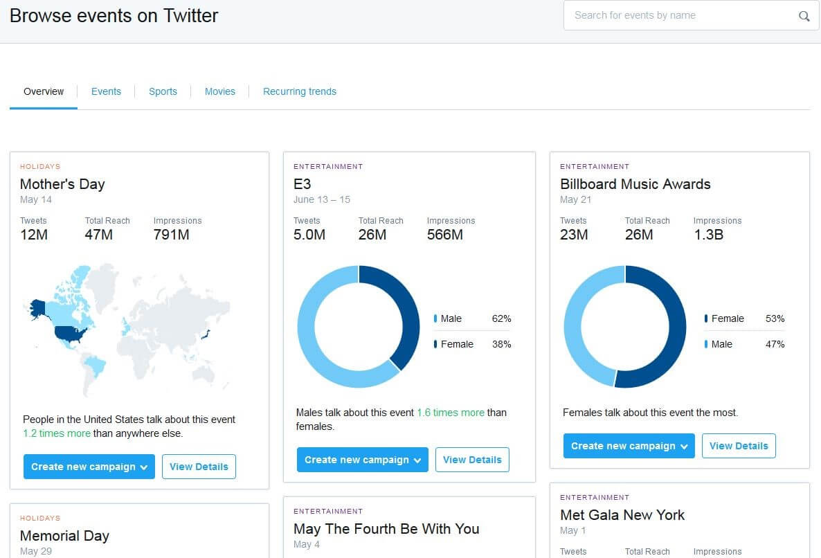 En el panel de control “Audiencias”, la herramienta Twitter Analytics facilita, por ejemplo, información sobre la ubicación de los seguidores, de modo que así se pueden crear tuits tomando como base el lugar en el que se encuentran. De esta manera se puede cubrir un amplio espectro de zonas horarias y se tiene, además, la posibilidad de estar presente en la celebración de festividades locales, partidos de fútbol, etc. También resulta útil la función de “Eventos” (Events) del menú, con la que se pueden buscar eventos públicos y filtrarlos por fecha, tipo de evento y lugar. La búsqueda de eventos basada en la ubicación de los followers ofrece la posibilidad de hacer comentarios sobre el entorno de una manera más específica y obtener, así, un mayor compromiso.