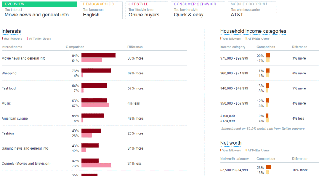 Algunas cuentas también contienen datos demográficos de los seguidores (sueldo, formación, profesión, propiedades, estado civil, etc.), sobre su estilo de vida o sobre sus hábitos de consumo. Twitter no se ha pronunciado, sin embargo, sobre los motivos por los que algunas cuentas contienen datos de usuario adicionales.