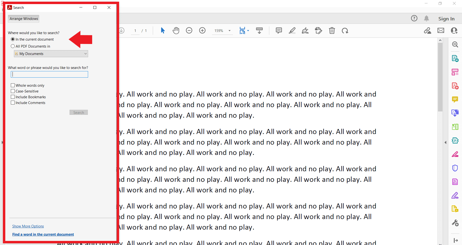 Paso 2. Se abrirá una ventana aparte para la búsqueda avanzada. Especifica si quieres que se realice la búsqueda solo en el documento PDF actual o en varios PDF al mismo tiempo.