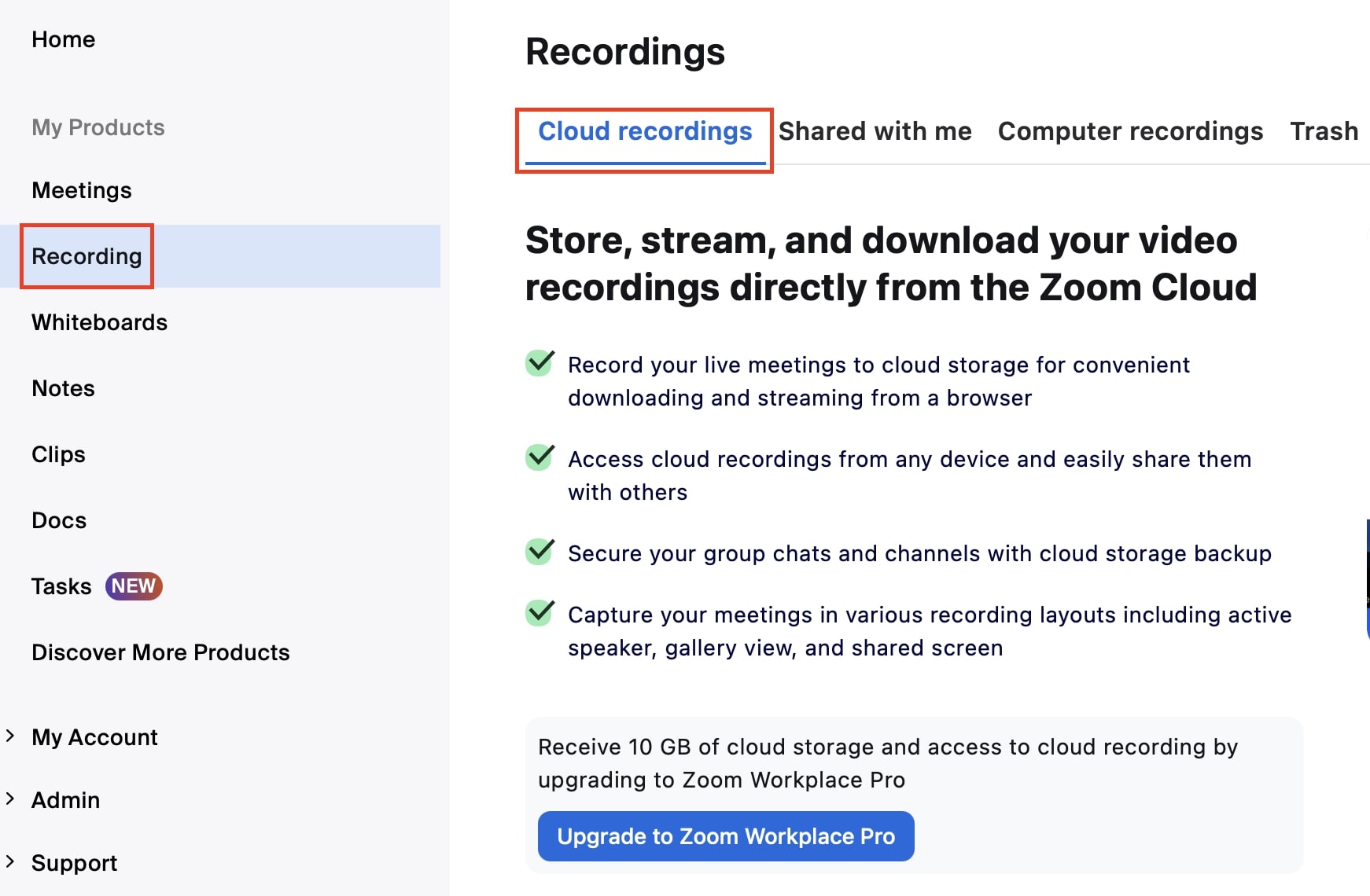 Paso 2: En la barra lateral izquierda, selecciona “Grabaciones” (Recordings) y, a continuación, la pestaña “Grabación en la nube” (Cloud recordings). Si aún no lo has activado, ve a “Perfil” y habilita la grabación en la nube en la sección correspondiente.