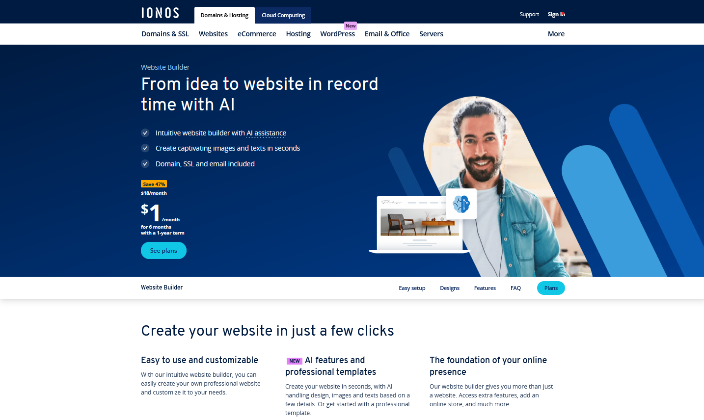 - IONOS: fácil de usar, con herramientas de AI para la creación automatizada de páginas e ideal para un uso sencillo