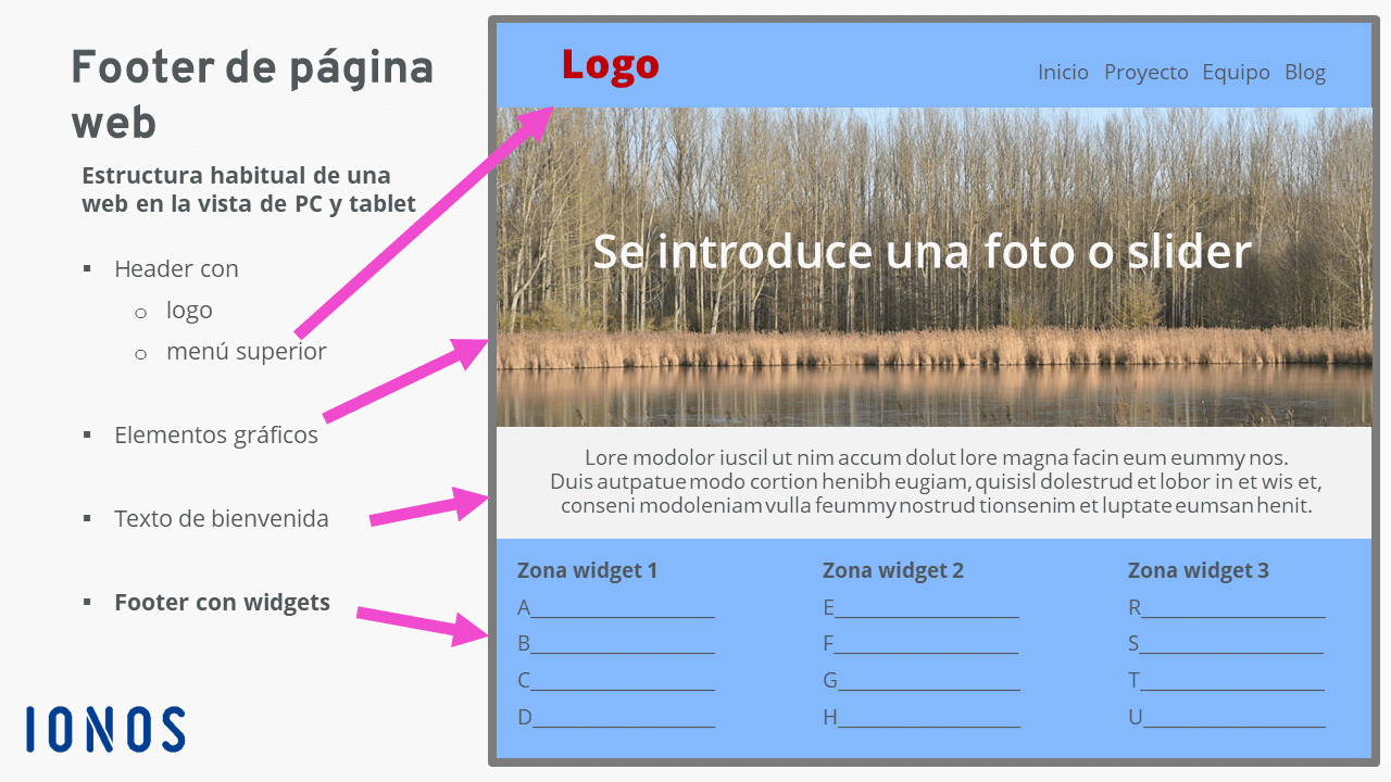 Cuando quieras integrar el footer de tu página web de forma coherente, lo mejor es que eches un vistazo a tu contenido y evalúes qué componentes deberían o deben complementarse con información repetida. Una solución elegante es añadir menús independientes al footer. Los programas de gestión de contenidos proporcionan los llamados widgets para este fin. Una estructura de menús clara garantiza que el footer conserve el mismo diseño en todo momento.