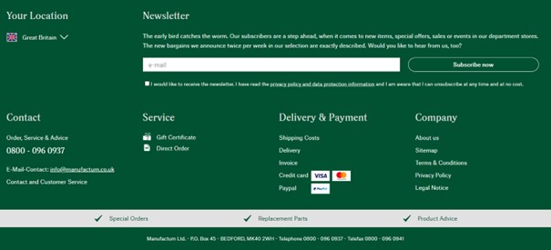 La empresa Manufactum opera una gran tienda online y gestiona grandes almacenes en 18 localidades. En consecuencia, el footer de la página web es bastante extenso, pero mantiene una estructura clara y anima a los clientes a suscribirse a la newsletter de la empresa ofreciendo un vale a cambio. La estrecha barra gris situada encima de los iconos de las tiendas de aplicaciones y de las redes sociales aporta además señales destinadas a animar a los visitantes de la página web a realizar una compra.