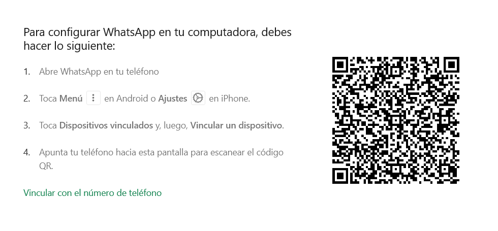 - Escanea el código QR que aparece al iniciar la herramienta. Para ello, simplemente tienes que abrir la aplicación de WhatsApp en tu smartphone y seleccionar la opción “Vincular un dispositivo”. Se abrirá un escáner con el que podrás escanear el código QR en tu app de escritorio.