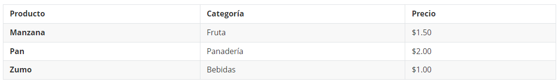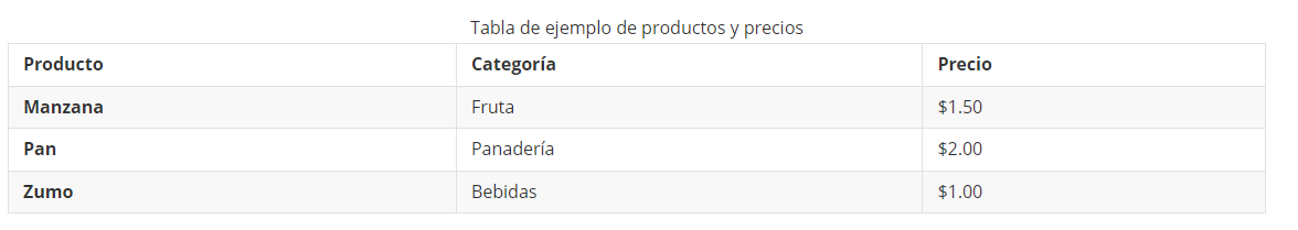 Si añadimos un encabezado <caption> con el texto “Tabla de ejemplo de productos y precios” a nuestro ejemplo anterior, el código quedaría así: