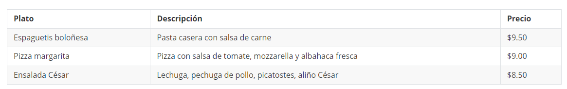 Para ilustrar las posibilidades de las etiquetas de tabla, a continuación, te mostramos un sencillo ejemplo de tabla HTML. Como ejemplo, se presentan descripciones y precios de tres platos. En la fila de cabecera, definimos los encabezamientos de las tres columnas “Plato”, “Descripción” y “Precio”. A continuación, aparecen otras tres filas en la que se ofrece la información. La tabla HTML tiene, por tanto, un total de cuatro filas y tres columnas: