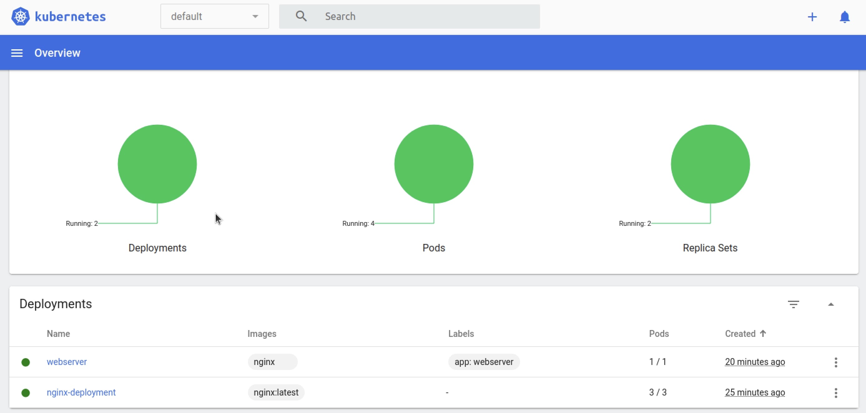 kubectl get nodesbashAhora ya puedes crear despliegues (deployments) desde el panel de control. Para ello, haz clic en la opción “Crear” (el signo “+” arriba a la derecha) y aparecerá un editor web en el que podrás crear un despliegue en formato JSON o YAML. Al hacerlo, Kubernetes generará automáticamente varios pods (grupos de contenedores), cuya cantidad puede modificarse escalando el despliegue. La función correspondiente se encuentra sobre el icono de tres puntos junto al despliegue.