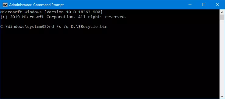 - En la línea de comandos, introduce la siguiente instrucción: rd /s /q X:\$Recycle.bin. Al copiar la instrucción, sustituye la “X” por la letra del disco donde se encuentre la papelera de reciclaje dañada según el mensaje de error. Solo se eliminarán los datos de la papelera de reciclaje de este disco.