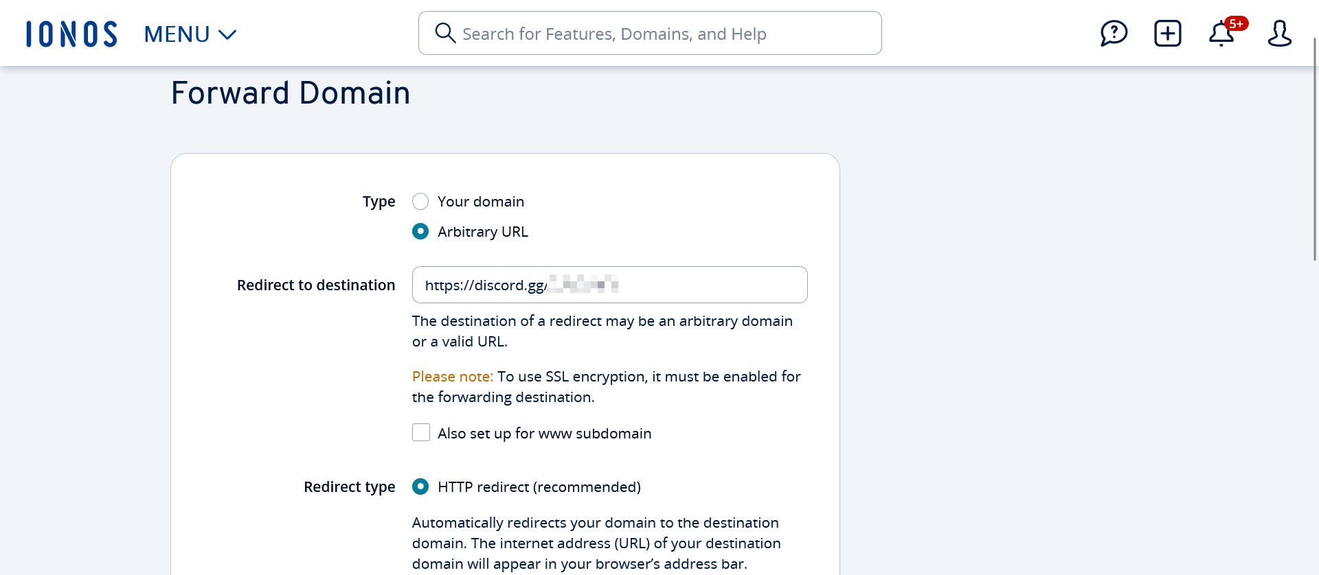 En tu cuenta de cliente de IONOS, haz clic en los tres puntos junto al subdominio para abrir el menú, y selecciona “Ajustar tipo de uso”. Desde ahí, entra en “Redirección de dominio”. Allí, selecciona “URL personalizada” en el campo “Tipo” y “Redirección HTTP” en el campo “Tipo de redirección”. Guarda los cambios para aplicar la configuración.