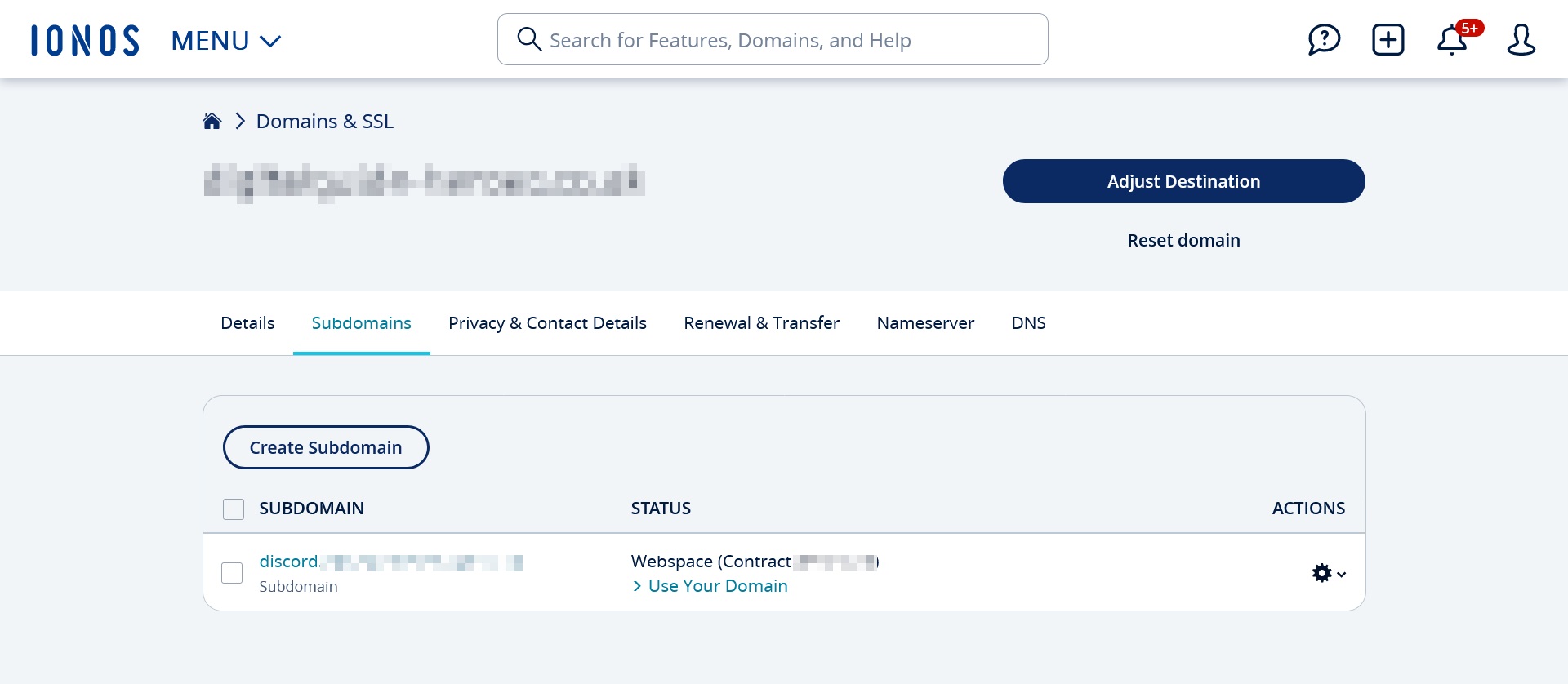 Lo primero que tienes que hacer es iniciar sesión en tu cuenta de cliente de IONOS. Una vez dentro, accede al apartado “Dominios y SSL”. Allí verás todos los dominios que tienes alojados en IONOS. Para redirigir el link de invitación de tu servidor de Discord, puedes usar el dominio completo o crear un subdominio.
