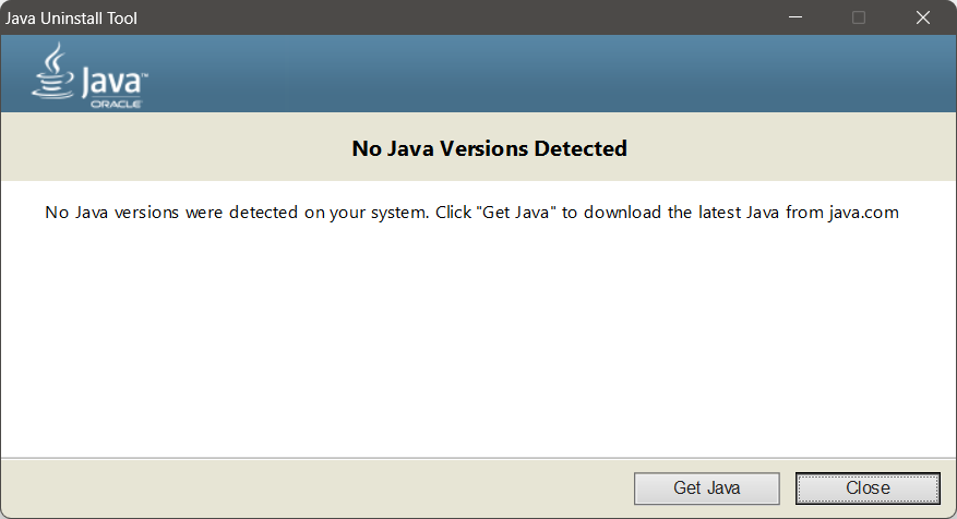 El software de servidor oficial de Minecraft es Java Edition. Por eso, has de comprobar si tu sistema dispone de una versión actual del entorno de ejecución. Primero, descarga Java Uninstall Tool, que examina las versiones de Java que están instaladas en tu sistema. Si la herramienta no encuentra ninguna versión de Java, te lo indicará y directamente te ofrecerá descargar Java. Haz clic en el botón “Get Java” para acceder a la página de descarga de Java.
