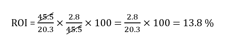 Si ahora multiplicamos los réditos circulantes (margen de beneficio) por la rotación de activo obtenemos para el periodo contable considerado un ROI de 13,8 %.