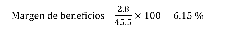 Para entender cómo se calcula el ROI, primero computamos los réditos circulantes (margen de beneficio) de la empresa dividiendo el beneficio obtenido por el volumen de negocio neto, y el resultado lo multiplicamos por 100 para obtener un porcentaje. En el caso de la empresa del ejemplo, se obtiene un margen de beneficio del 6,15 %.