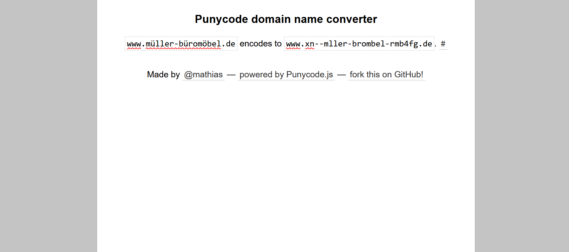 IDN-domeenis „müller-büromöbel“ esinevad tähemärgid „ü“ ja „ö“, mida varem domeeninimede jaoks lubatud tähemärkide hulka ei kuulunud. Seetõttu tuleb need ühilduvuse tagamiseks kodeerida Punycode’i abil.