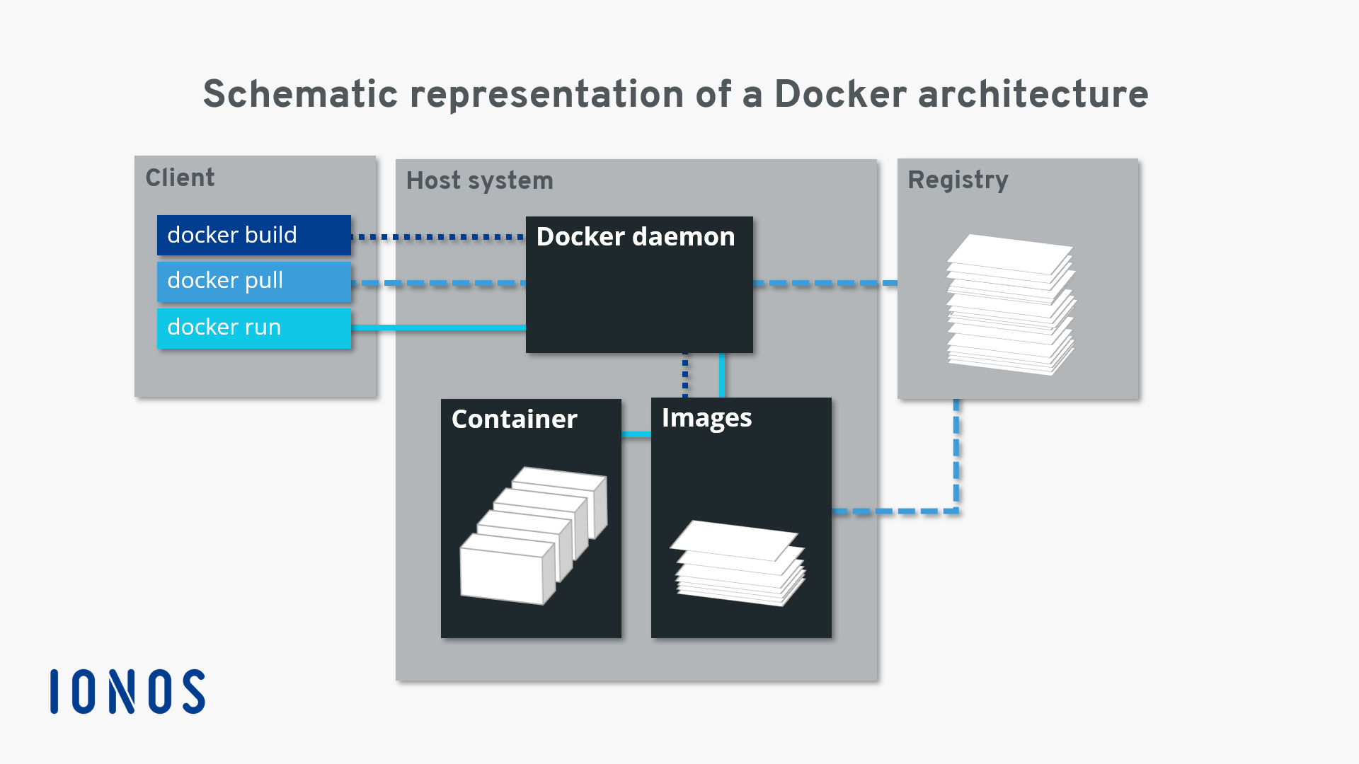 Käsk docker build annab Docker-daemonile käsu luua pilt (punktiirjoon). Selleks peab olema olemas vastav Dockerfile. Kui pilti ei soovitata luua, vaid laadida Docker Hubi hoidlast, kasutatakse käsku docker pull (katkendjoon). Kui Docker-daemonile antakse käsk docker run käivitada konteiner, kontrollib taustaprogramm, kas vastav konteineripilt on kohalikult kättesaadav. Kui on, siis käivitatakse konteiner (täisjoon). Kui daemon pilti ei leia, algatab ta automaatselt selle allalaadimise hoidlast.