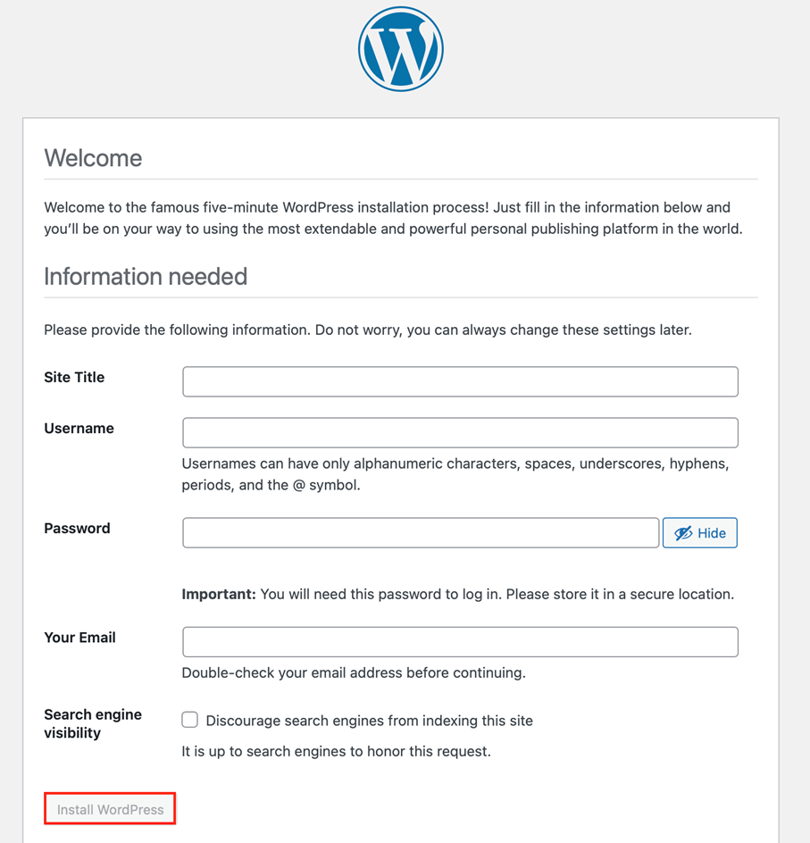 Napsauta sitten Asenna WordPress -painiketta asennuksen loppuun saattamiseksi.