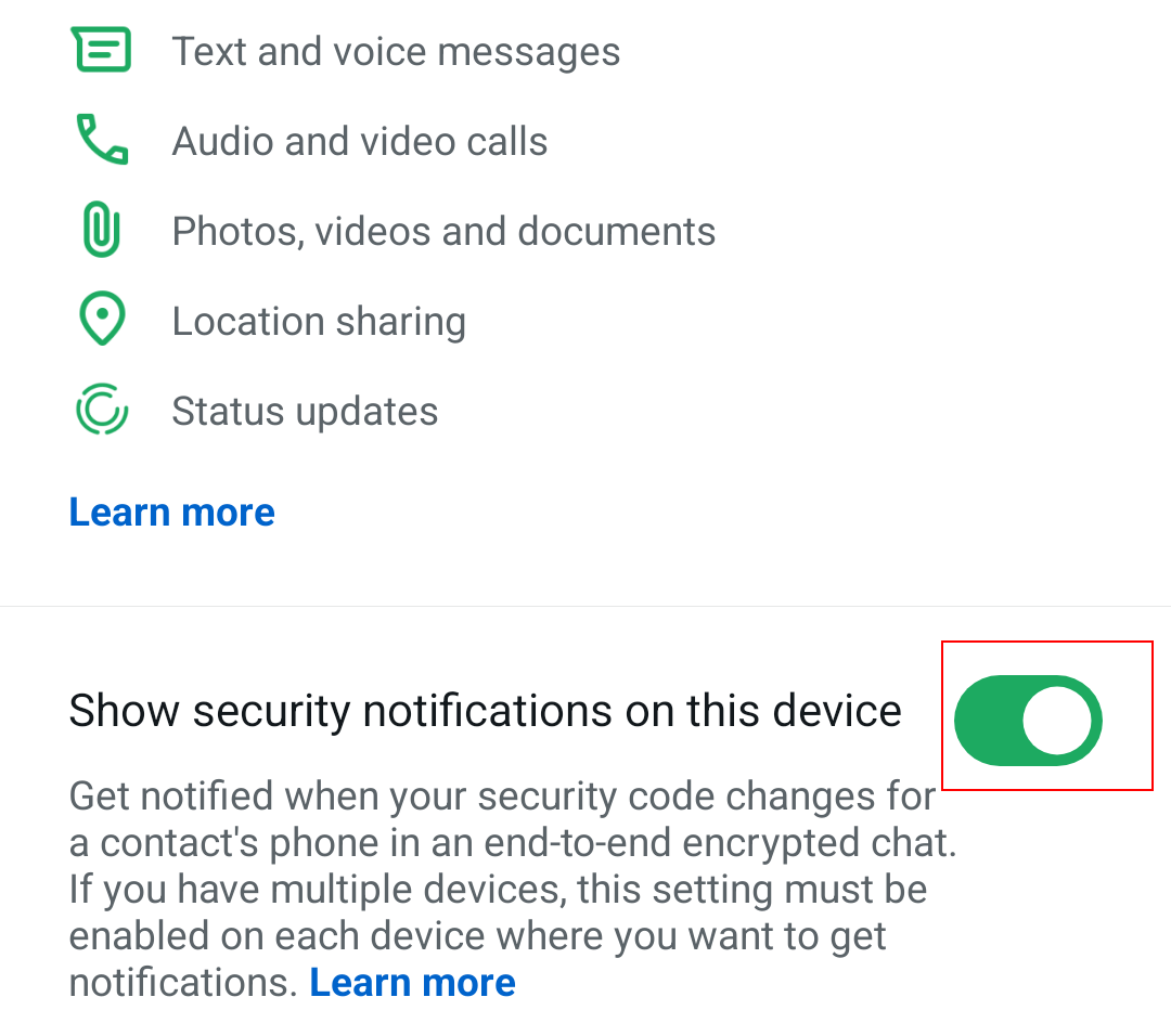 Jokaisessa WhatsApp-keskustelussa on päästä päähän -salaus ja oma turvakoodi. Turvakoodi voi muuttua esimerkiksi silloin, kun sinä tai yhteyshenkilösi olette ottaneet käyttöön uuden mobiililaitteen tai asentaneet WhatsAppin uudelleen. Ota turvallisuusilmoitukset käyttöön, jotta saat ilmoituksen näistä muutoksista.