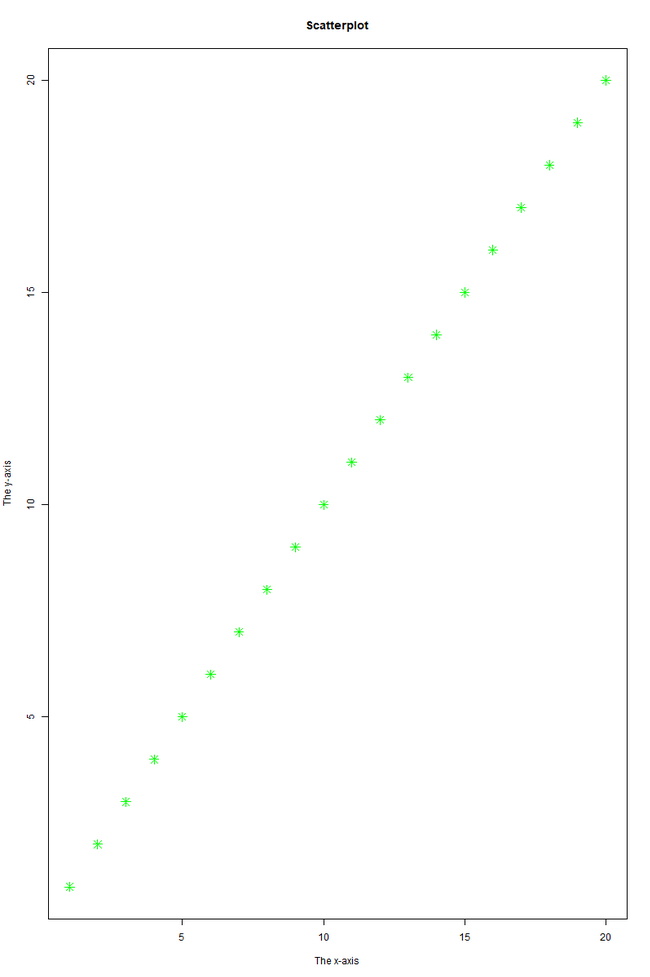plot(1:20, type = "p", col = "green", pch = 8, cex = 1.5, main = "Scatterplot", xlab = "The x-axis", ylab = "The y-axis")RTuloksena oleva kaavio näyttää seuraavalta: