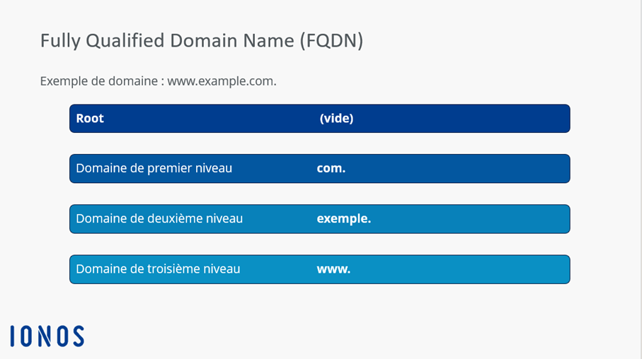 La structure du domaine cité en exemple se décompose de droite à gauche : Root-Label, extension (domaine de premier niveau), domaine de deuxième niveau, puis domaine de troisième niveau. De cette manière, le FQDN de www.exemple.com contient quatre sections. En principe, les domaines peuvent contenir des sous-domaines inférieurs aux domaines de troisième niveau.