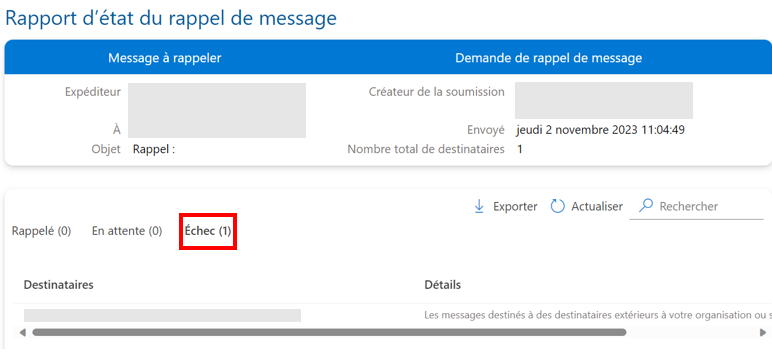 Si la personne qui reçoit le message a défini une règle selon laquelle le message d’origine et l’email de rappel sont placés dans des dossiers différents, le rappel échoue. Si les deux emails sont placés dans le même dossier, le succès du rappel dépend à nouveau de l’email qui sera ouvert en premier.