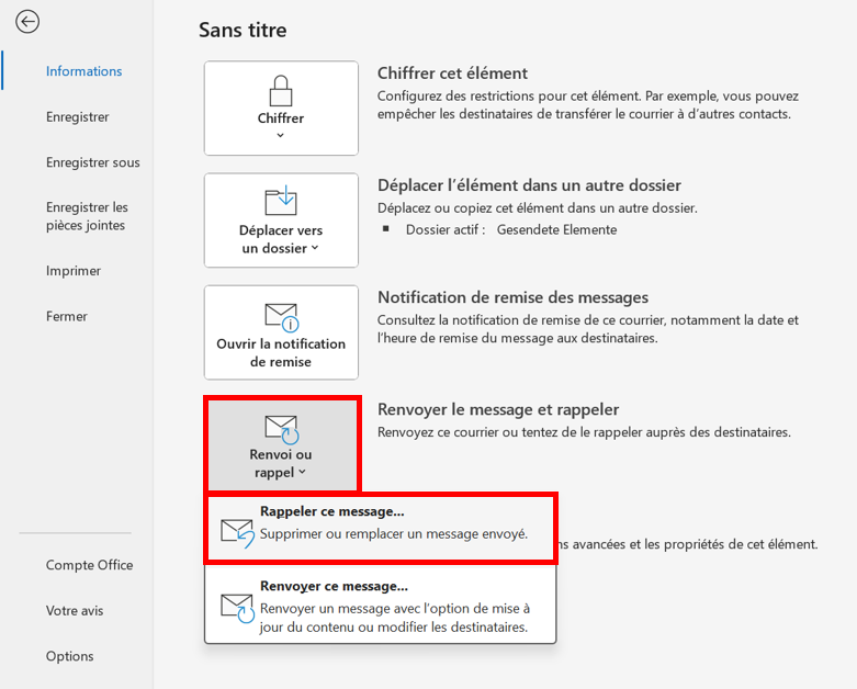- Cliquez sur « Fichier > Rappeler ce message… ».