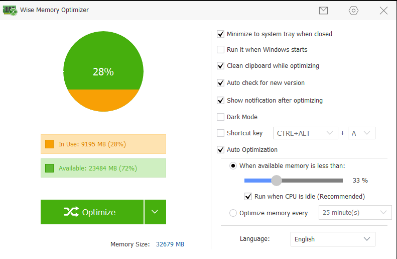 Dans les paramètres de Wise Memory Optimizer, vous pouvez activer l’optimisation automatique. Grâce à un curseur, vous définissez le seuil d’occupation mémoire à partir duquel le nettoyage s’exécute automatiquement (par exemple, lorsque moins de 33 % de RAM sont disponibles).
