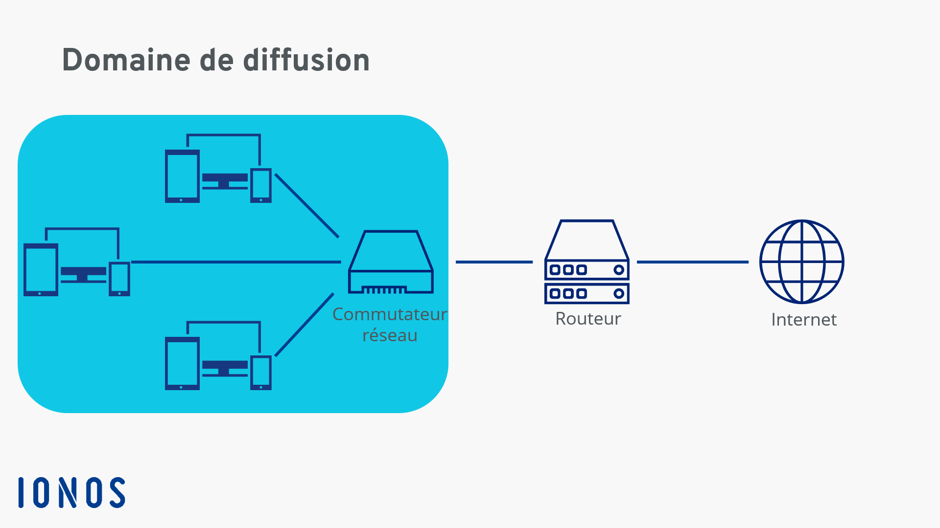 En pratique, presque tous les nœuds de communication interconnectés par des commutateurs et répéteurs font partie du même domaine de diffusion. Le domaine s’arrête en revanche au niveau d’un routeur, car l’appareil de réseau fonctionne sur la couche réseau (couche 3). C’est pour cette raison que les ordinateurs entrant en contact les uns avec les autres via Internet ne font pas partie du même domaine de diffusion.
