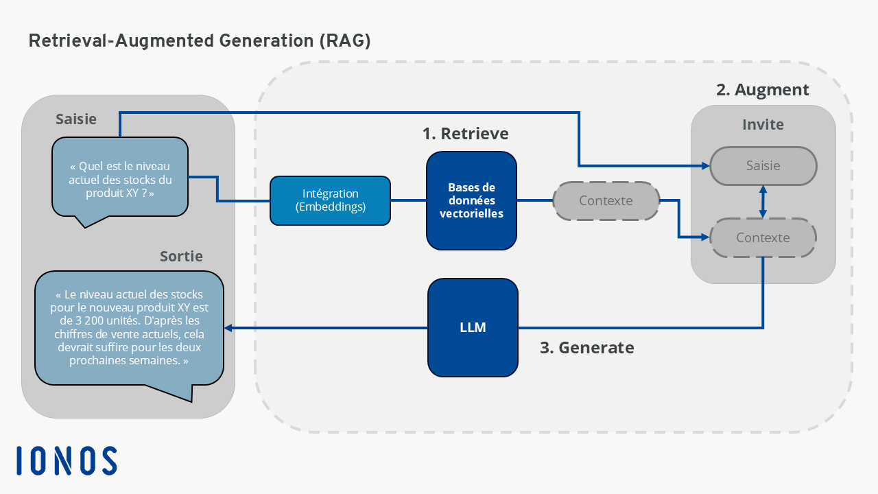 Les informations récupérées sont ensuite intégrées dans le contexte de la demande initiale à l’aide de techniques d’ingénierie des invites pour créer une invite augmentée. Celle-ci combine la question initiale et les données pertinentes, permettant ainsi au LLM de générer une réponse plus précise et plus informative.