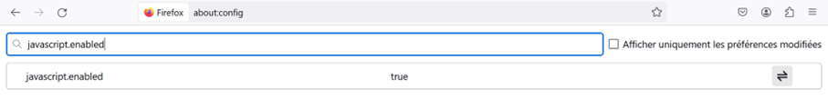 Si vous souhaitez modifier la valeur et activer ou désactiver JavaScript dans Firefox, cliquez sur l’icône à droite montrant deux flèches qui pointent dans des directions différentes.