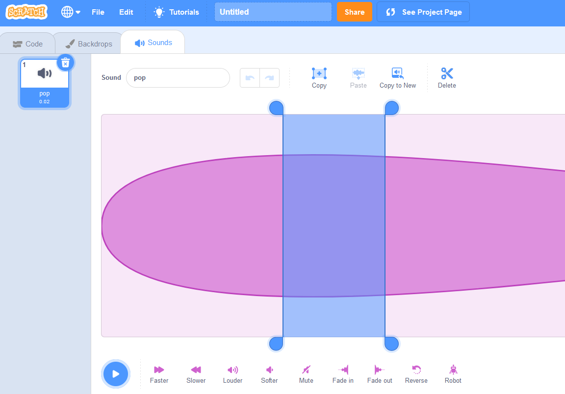Les sons que vous insérez se retrouvent dans le menu latéral à gauche, et vous pouvez les sélectionner par un clic de souris pour les modifier et les éditer de plusieurs manières. Vous pouvez entre autres découper des séquences sonores, ajuster le volume, accélérer ou ralentir la vitesse de lecture. Comme il est également possible d’insérer des sons dans un projet Scratch à l’aide de scripts, il est important de nommer correctement tous les sons que vous insérez dans le champ « Son ».