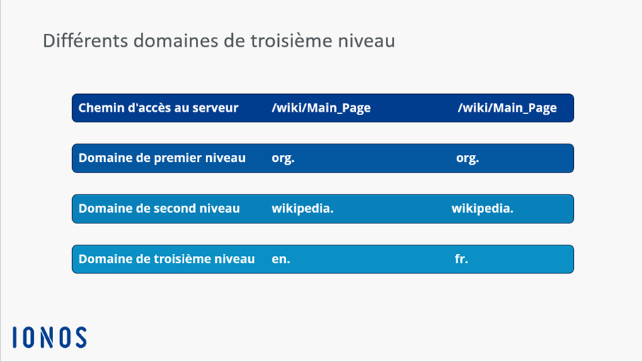 On trouve, subordonnés à ces trois sections, les domaines de troisième niveau. Ce sont des sous-domaines qui précèdent le domaine de deuxième niveau, à sa gauche dans le nom complet de domaine (FQDN). Ils permettent de définir les sous-adresses d’un domaine et d’ainsi séparer distinctement les différentes parties. Les propriétaires de domaine ont donc la possibilité de mettre à disposition d’autres pages de destination, services ou serveurs. Les noms courants de ce domaine de troisième niveau sont www pour les services Web, m pour les mobiles, mail, imap ou pop3 pour les serveurs mail, ainsi que divers codes pays spécifiques. L’encyclopédie en ligne Wikipédia est une illustration parfaite de cette dernière option. Voici comment sont structurés ces noms de domaine spécifiques grâce au domaine de troisième niveau :