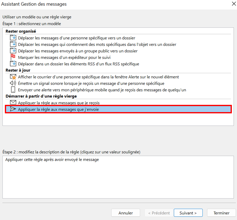 - Sélectionnez l’option « Appliquer la règle aux messages que j’envoie » et cliquez sur « Suivant ».