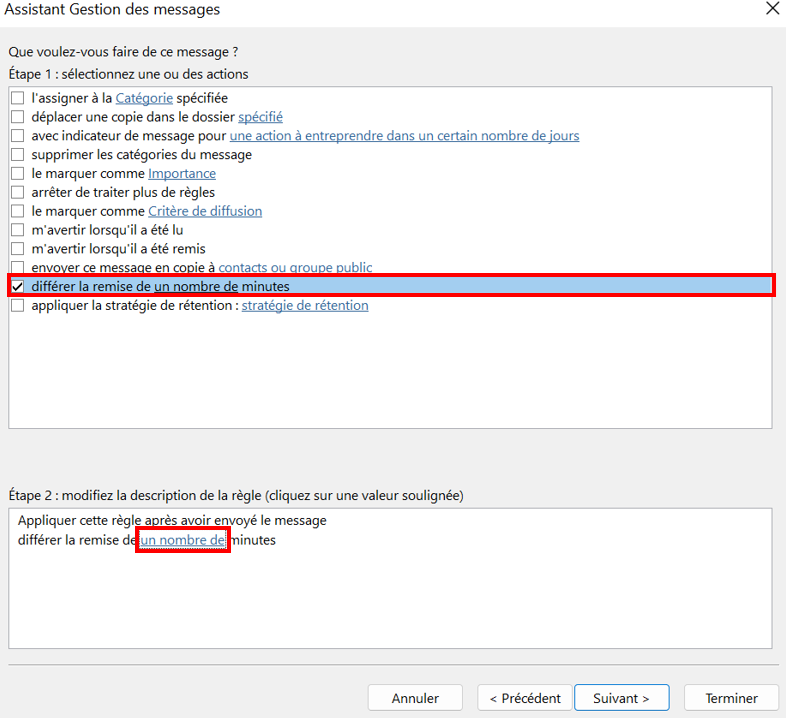 - Dans la boîte de dialogue suivante, cochez la case à côté de l’option « Différer la remise de un nombre de minutes ». Cliquez dans le deuxième champ en bas sur « un nombre de » en bleu pour définir le délai souhaité.