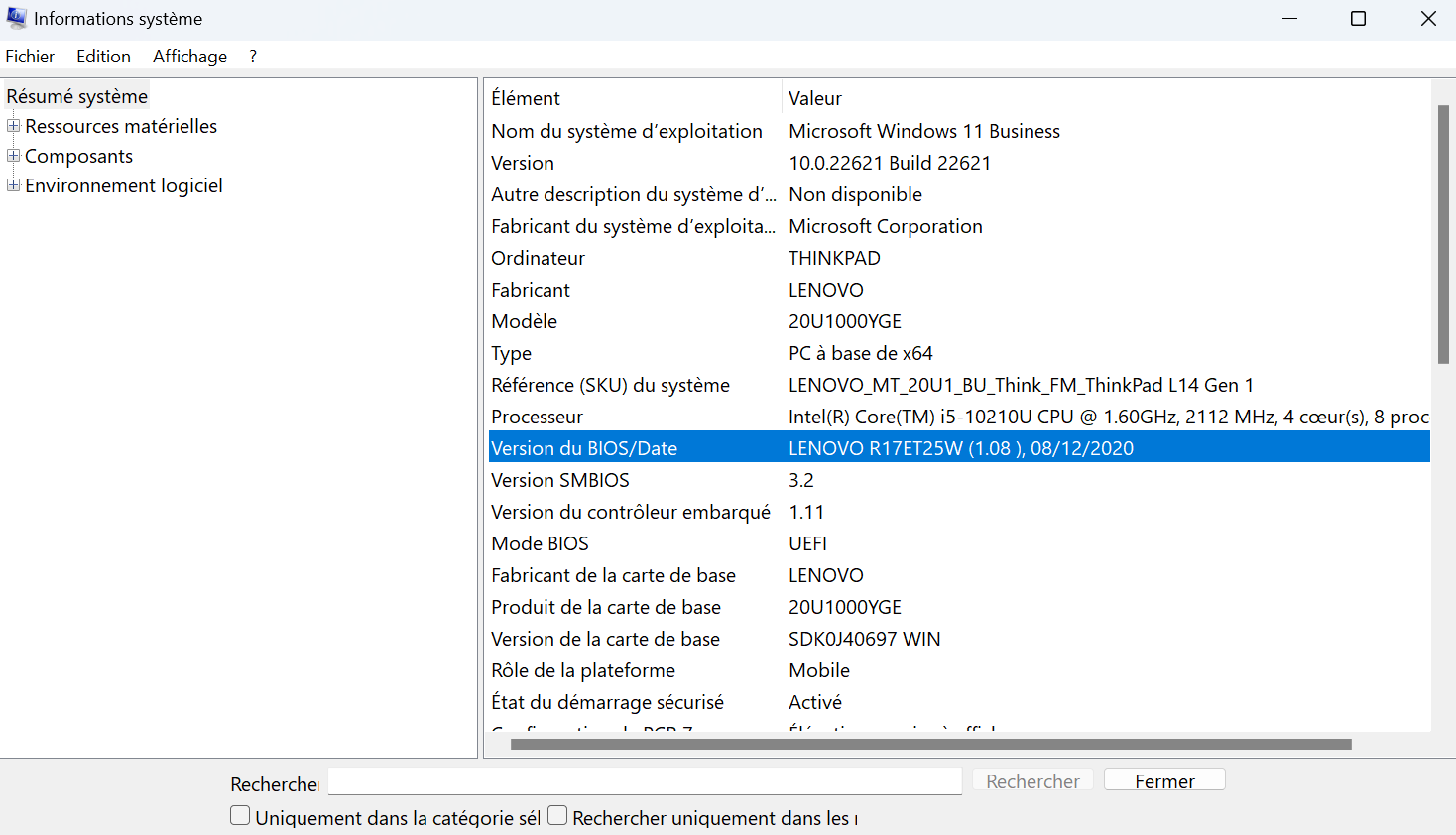 Sous Windows, vous trouverez également les détails essentiels dans les informations système, auxquelles vous pouvez facilement accéder à l’aide de la fonction de recherche. Vous pouvez également y trouver la version du BIOS actuellement utilisée.