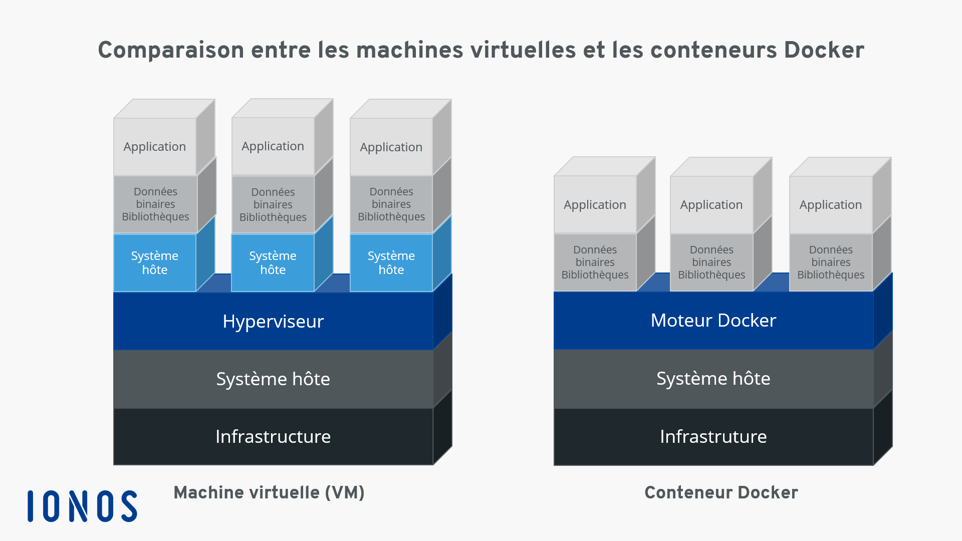 Le principal avantage de la virtualisation basée sur les conteneurs réside dans la possibilité d’exécuter des applications avec des exigences différentes de manière isolée les unes des autres, sans supporter les frais généraux d’un système invité séparé. De plus, les applications peuvent être déployées avec des conteneurs sur diverses plateformes et infrastructures, sans nécessiter d’adaptation aux configurations matérielles ou logicielles du système hôte. Docker est le projet logiciel le plus connu qui met à la disposition des utilisateurs une technologie de virtualisation basée sur des conteneurs. La plateforme open source s’appuie sur trois composants de base : pour exécuter des conteneurs, les utilisateurs n’ont besoin que du moteur Docker et d’images Docker spéciales, qu’ils peuvent obtenir ou créer eux-mêmes via le Hub Docker.