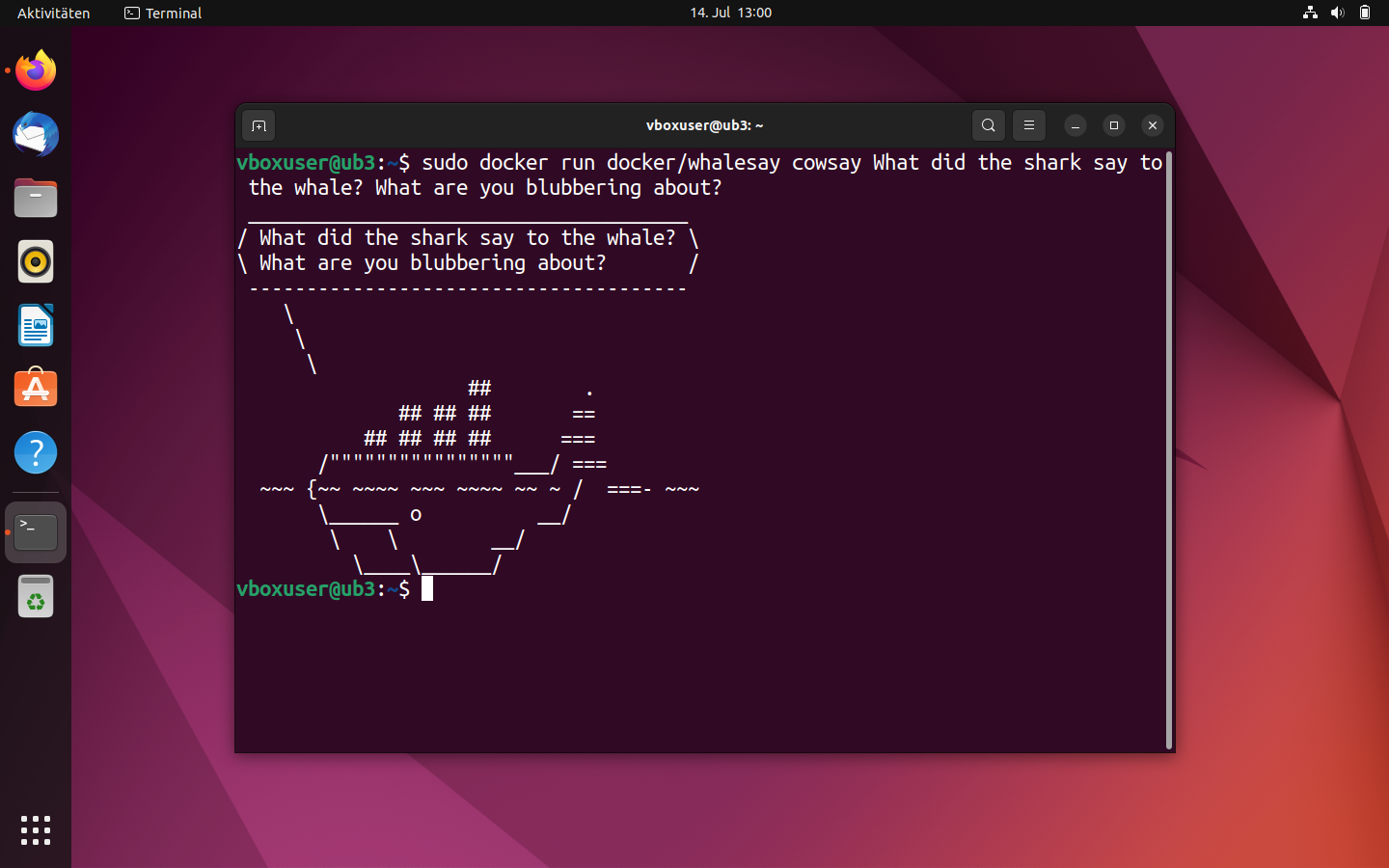 Comme cowsay, whalesay de Docker vous offre la possibilité d’intervenir dans le déroulement du programme afin de modifier la sortie de texte dans le terminal. Testez cette fonction en remplaçant le « boo » de la commande de sortie par une chaîne de caractères de votre choix, par exemple par une blague nulle sur les baleines !
