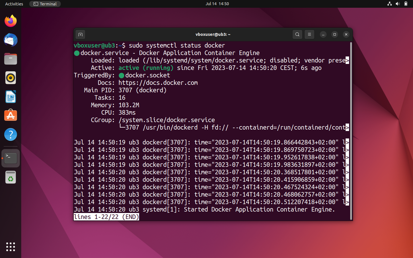 sudo systemctl status dockerbashSi le moteur Docker est actif sur votre système Ubuntu, la sortie dans le terminal devrait correspondre à celle de la capture d’écran suivante :