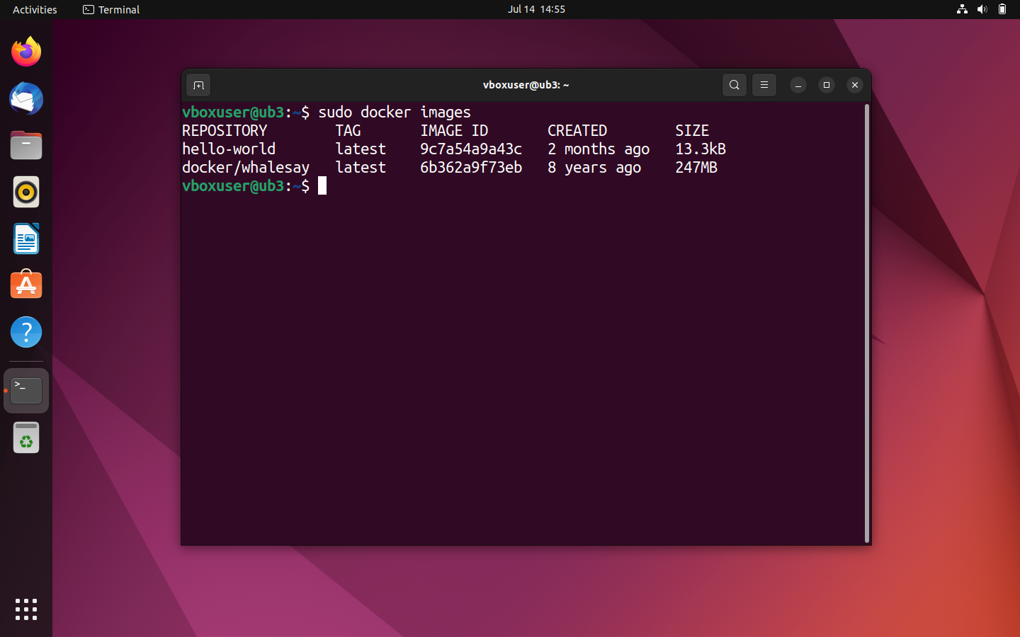 sudo docker imagesbashLa commande docker images vous permet de consulter toutes les images locales, y compris la taille du fichier, le tag et l’ID de l’image.