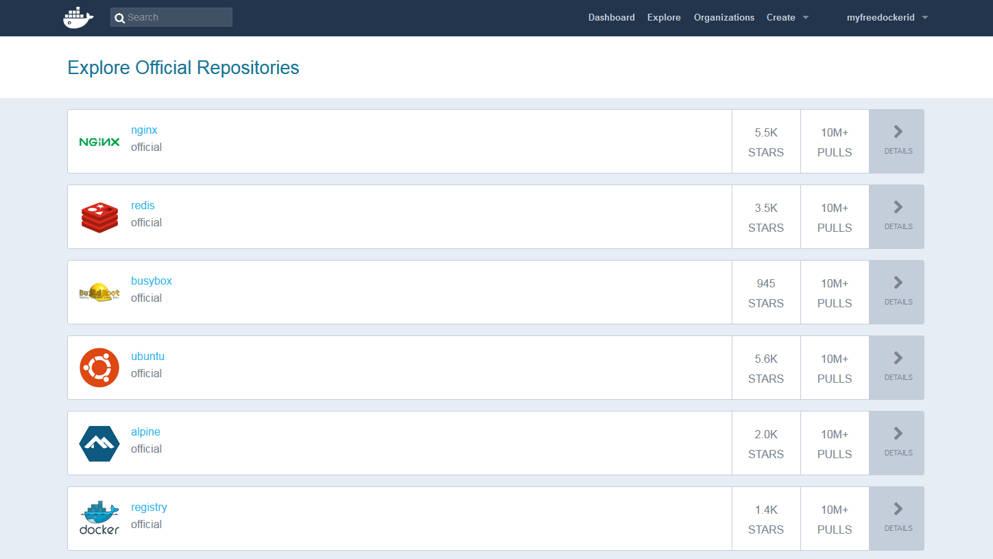 Outre les registres publics des autres utilisateurs, vous trouverez sur le hub de nombreuses ressources correspondant aux images d’archives officielles de l’équipe de développeurs et de célèbres projets open source. Les images les plus populaires de Docker sont le serveur Web léger NGINX, la base de données in memory Redis, la boîte à outils BusyBox d’Unix et la distribution Linux Ubuntu.