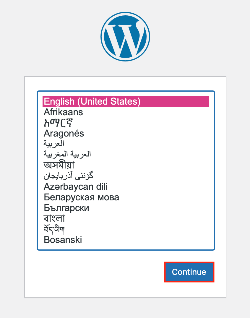 Visitez l’URL dans un navigateur, choisissez votre langue d’installation, puis cliquez sur « Continue » (« Suivant »).