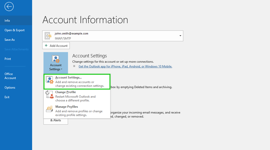 To check and change the sender address in Microsoft Outlook 2016/2019, follow the steps below: