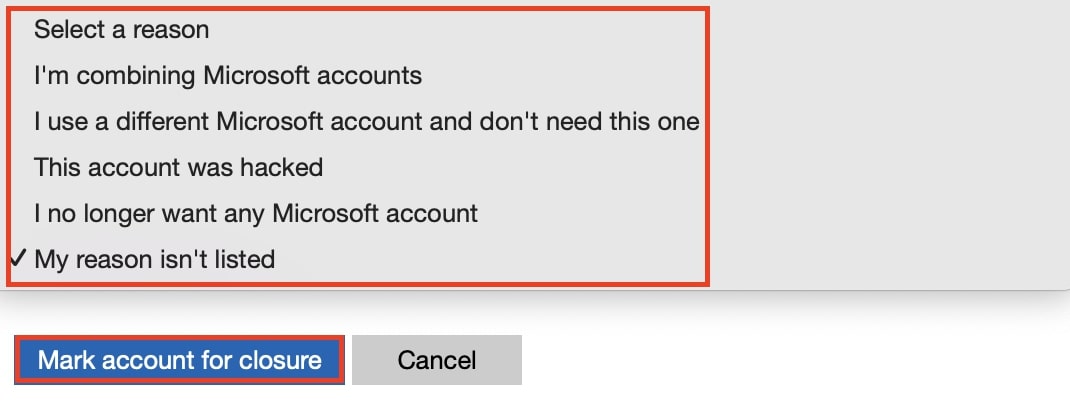 5 žingsnis: Dabar pasirinkite priežastį, dėl kurios norite uždaryti savo sąskaitą. Tada spustelėkite mygtuką „Pažymėti sąskaitą uždarymui“.