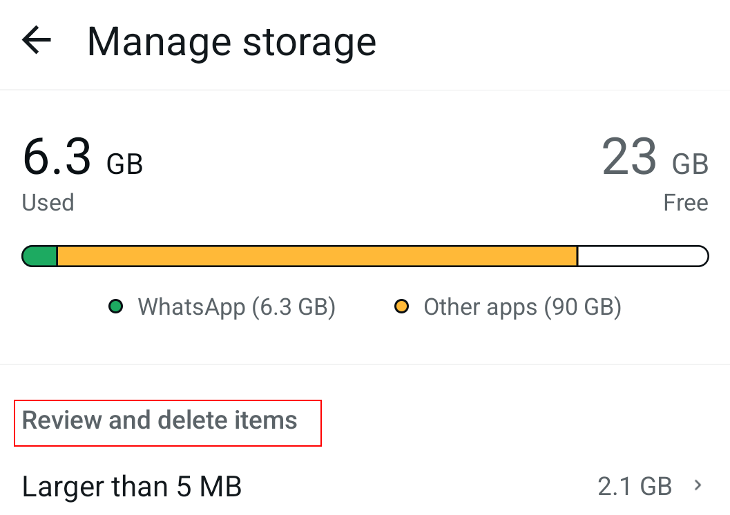 „WhatsApp“ nustatymuose pasirinkite „Saugykla ir duomenys“, tada – „Valdyti saugyklą“. Ten bus rodomi failai, kurių dydis viršija 5 MB. Ištrinkite turinį, kuris užima daug vietos ir (arba) kurio jums nebereikia.