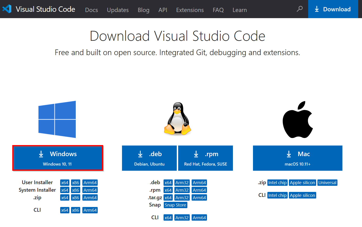 Jei dar neturite įdiegtos „VS Code“, galite ją atsisiųsti iš oficialios svetainės. Pasirinkite operacinę sistemą „Windows“ ir dukart spustelėkite, kad pradėtumėte diegimą.